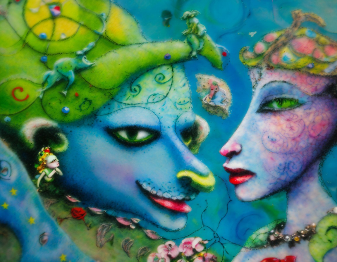 The image features two surreal, whimsical characters: a regal woman with intricate headwear and a blue feline-like figure. Both have captivating eyes, set against a vibrant, dreamlike background.