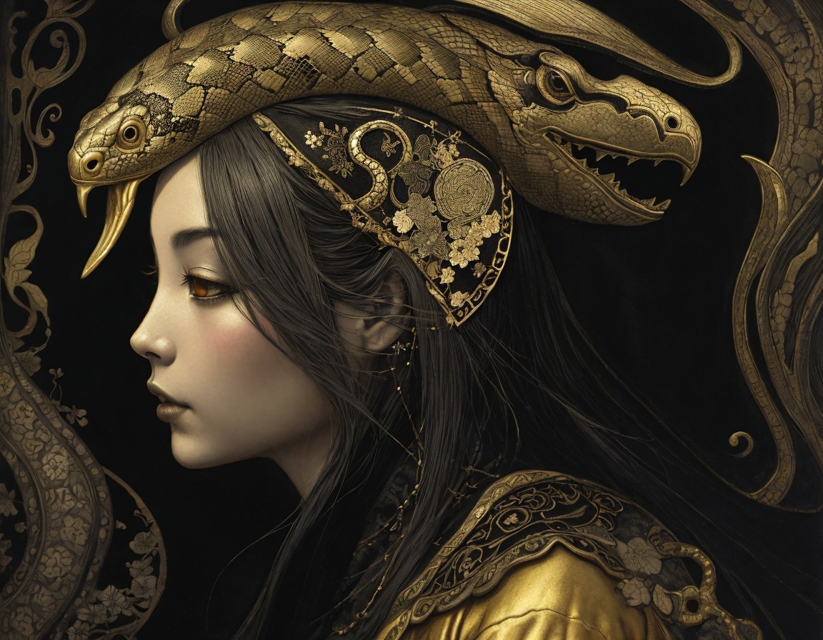 Legend of the Girl and the snake charmer, Medieval Japanese Artists Sumi-e Style, Velvet Black, Shabby, Dull Gold, Amber Gray, Golden Ratio, Surreal Fantasy, Elegant, High Definition Ultra Fine 3D Line, Zenangle Style, Watercolor Patchwork , Arthur Rackham Style, Paul Kidby, Gediminas Prankevicius, Jacek Jerka, Extremely Detailed, Intricate, Thoughtful, HDR, Fractal, Beautiful, Award Winning, Fantasy Look, Fantasy, Crisp Quality