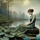 A woman in an apron prepares fresh greens and limes at a rustic kitchen counter, surrounded by plants and jars, with a serene outdoor view illuminated by soft sunlight.