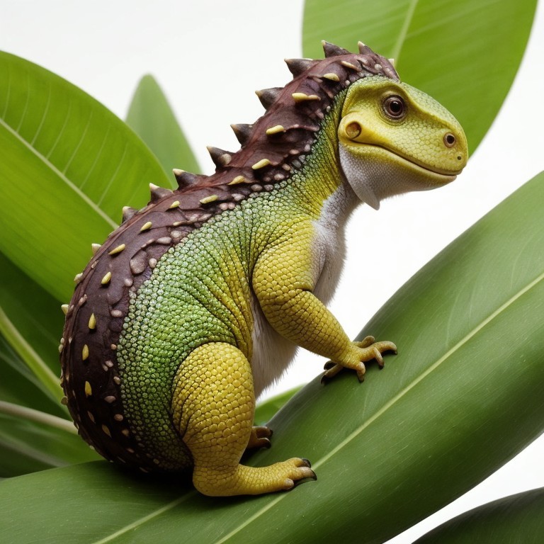 A whimsical, toy-like dinosaur with green skin and purple spots sits on a leafy green background, exuding a playful and friendly vibe.