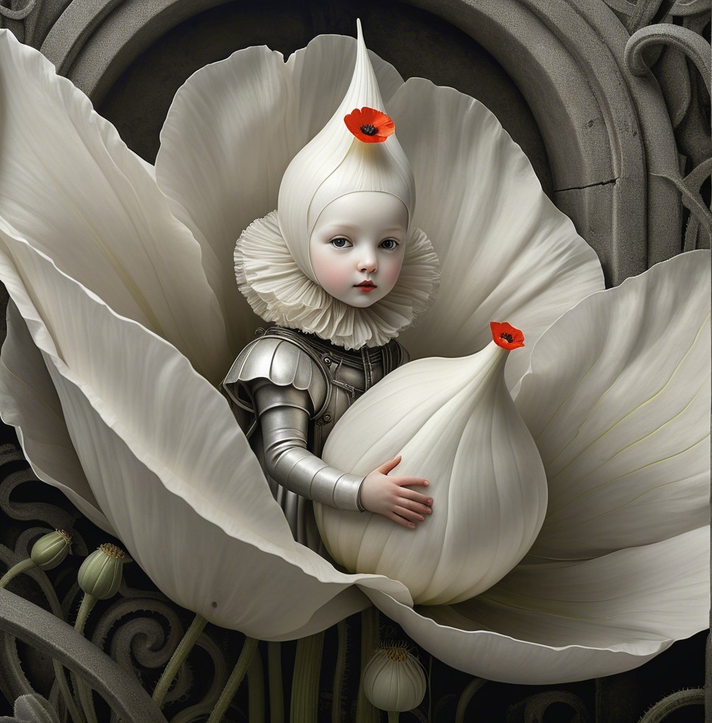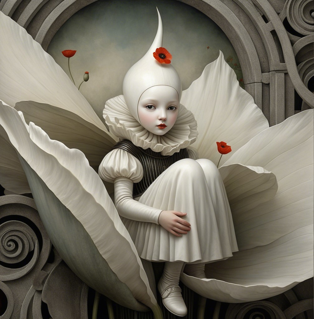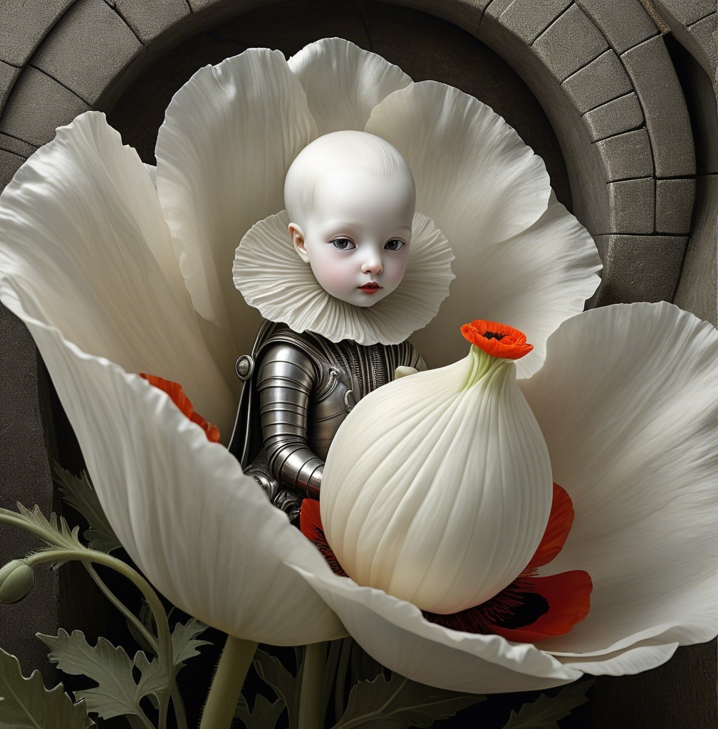 A surreal artwork featuring a doll-like face emerging from large, delicate poppy flowers. The striking contrast and intricate details create a dreamlike, ethereal atmosphere.