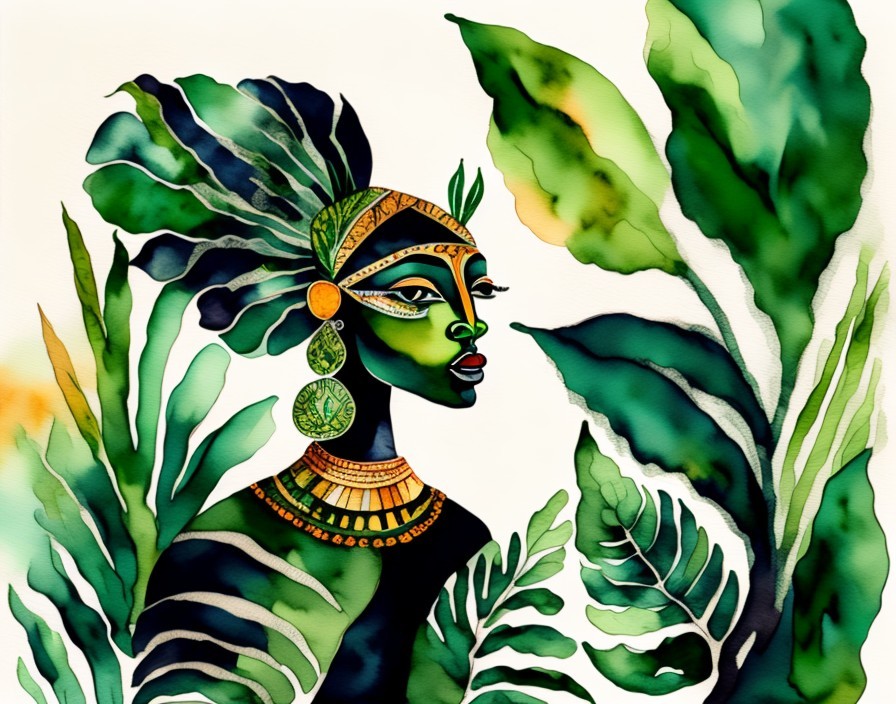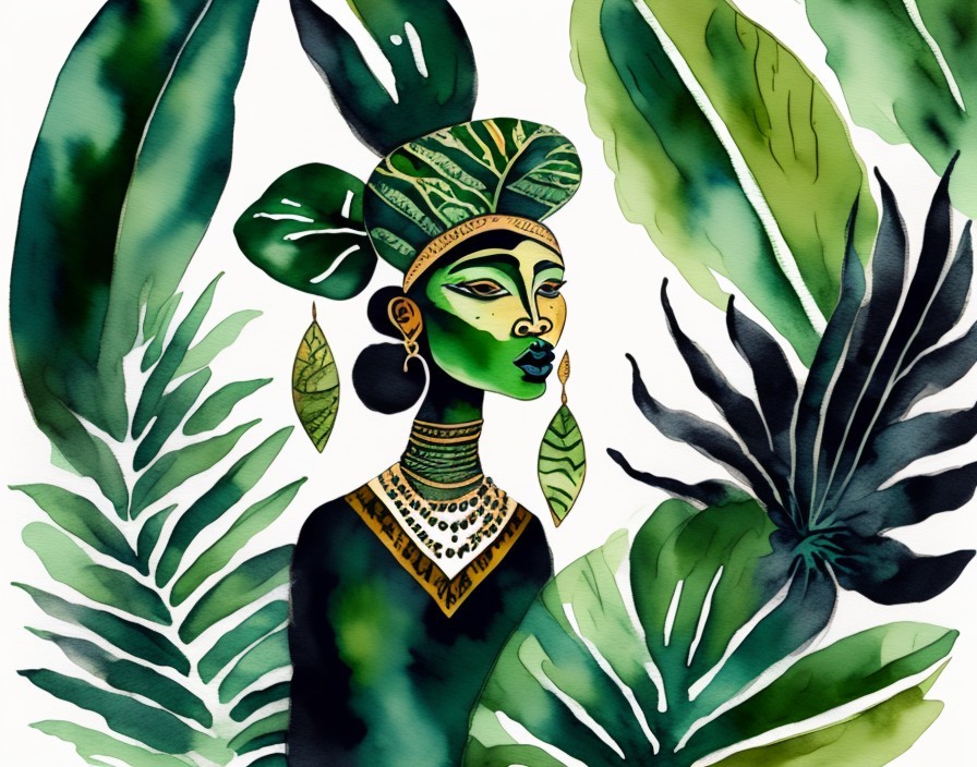 As a watercolor and ink print painting create a portrait of a green eyed African woman wearing tribal tatoos on the face. Matisse’s stylized leaves from dark blue to light green in the background.