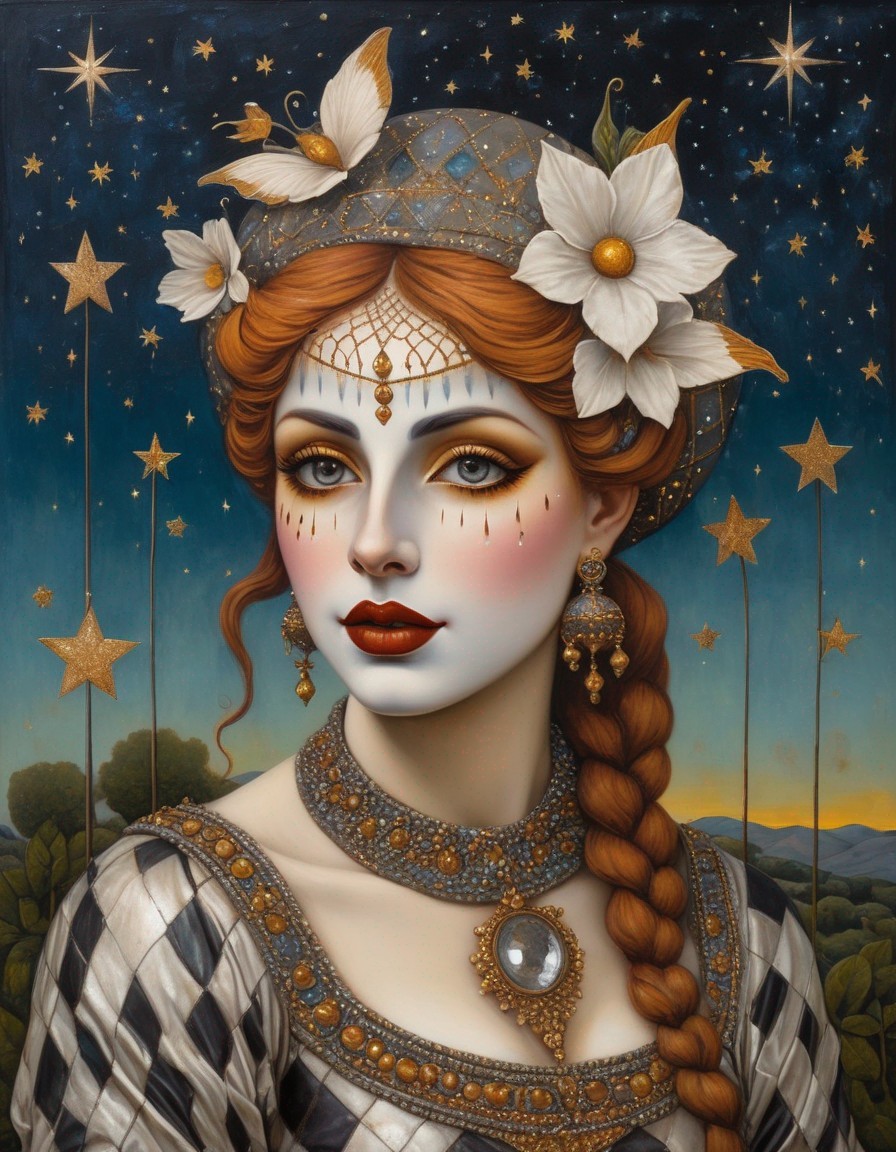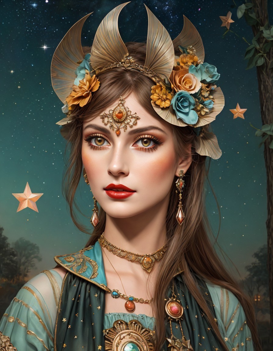 A stylized portrait of a woman with an ornate golden crown, starry background, dramatic makeup, and a medieval-inspired dress.