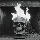 A vivid painting depicts a skull in front of a roaring flame, surrounded by logs. The warm colors of the fire contrast with the dark background, creating an intense and dramatic atmosphere.