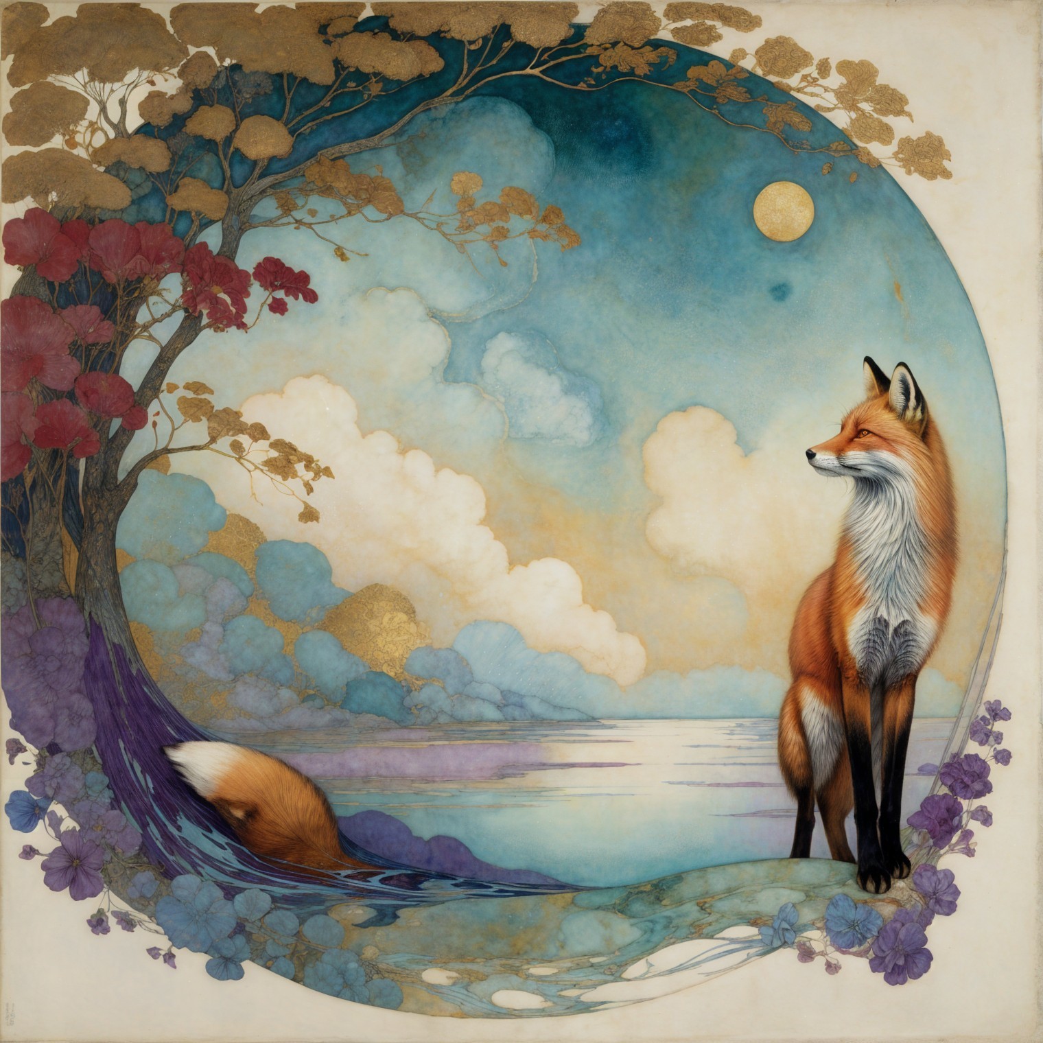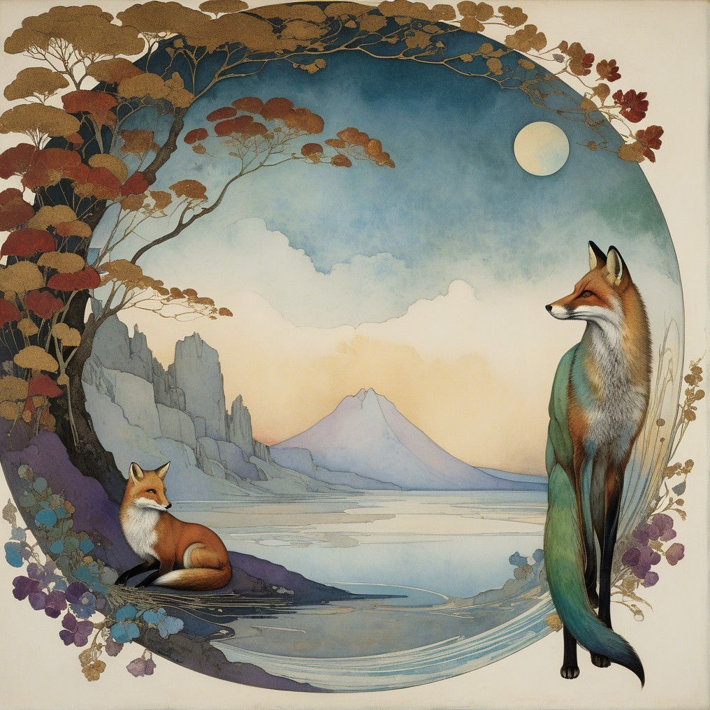 A beautifully illustrated fox stands confidently against a backdrop of swirling colors and delicate gold detailing, surrounded by floral motifs and serene landscapes, evoking a sense of harmony.