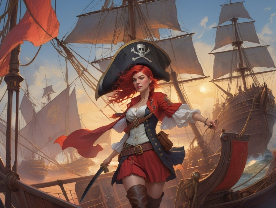 A fierce female pirate stands confidently on a ship, wearing a feathered hat and red coat. Tall ships sail in the background under a vibrant sunset, embodying adventure and rebellion.