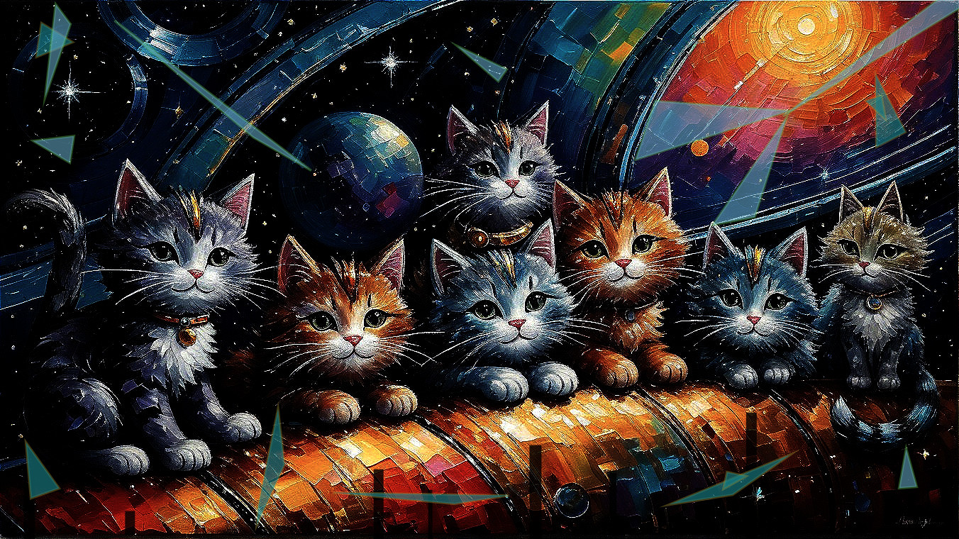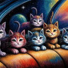 A colorful, whimsical painting featuring eight cats of various breeds and colors, posed together on a futuristic spaceship against a cosmic backdrop of stars and planets.