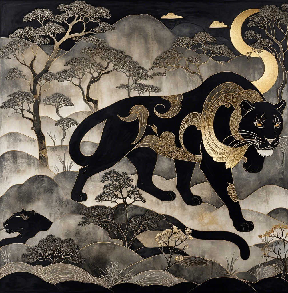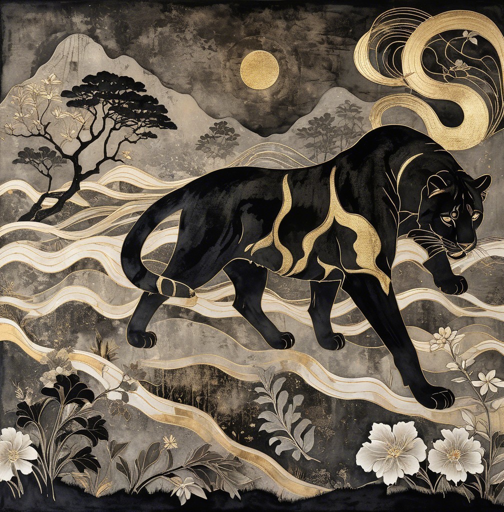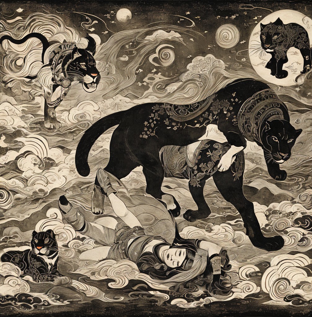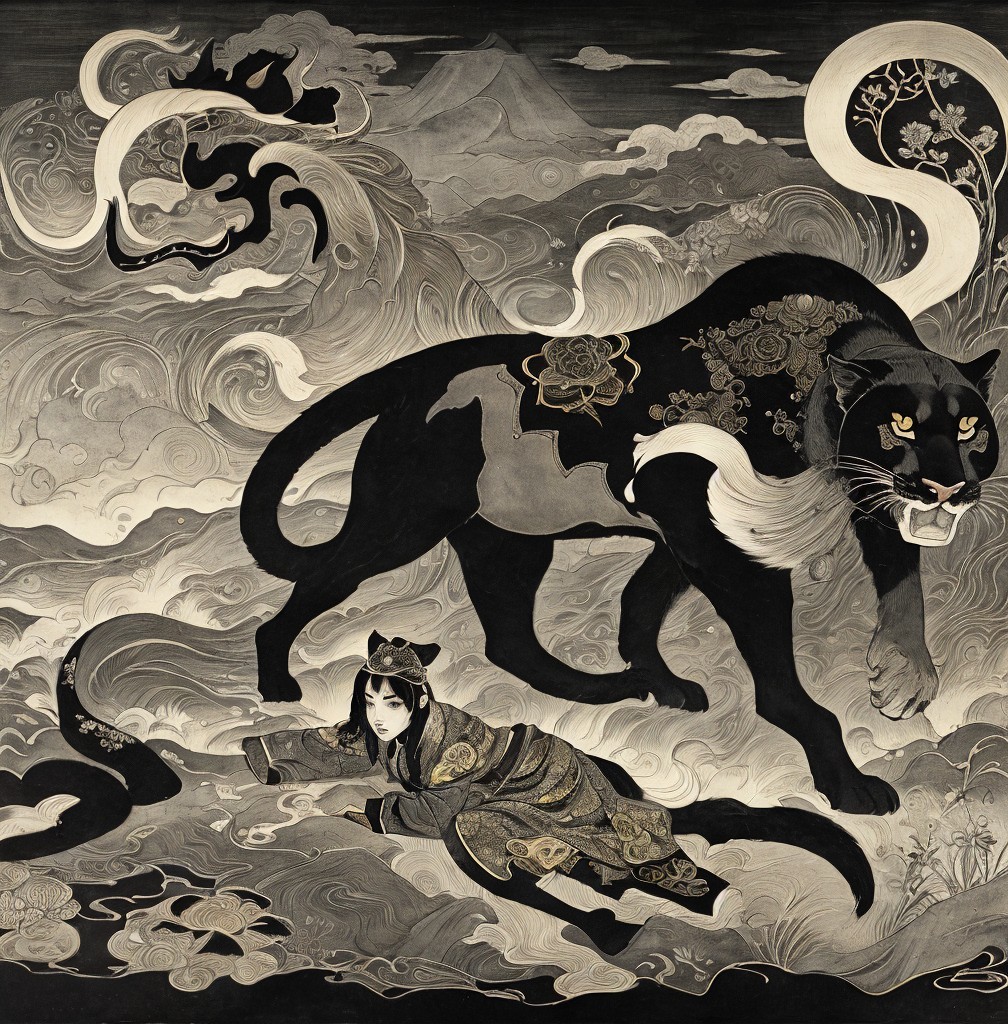 Legend of the Girl and the panther , Medieval Japanese Artists Sumi-e Style, Velvet Black, Shabby, Dull Gold, Amber Gray, . dramatic