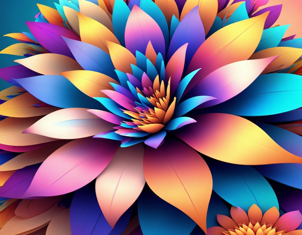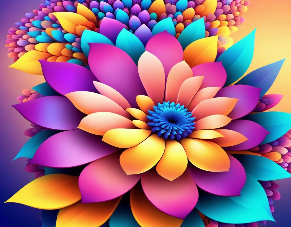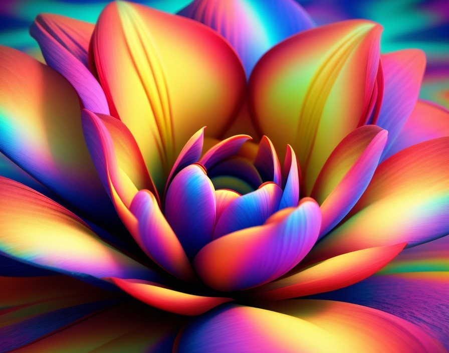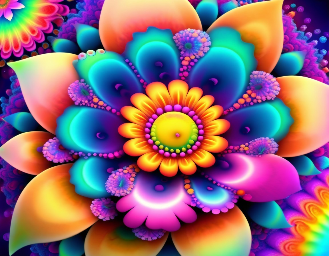 Vibrant, multi-colored digital lotus flowers bloom against a dark background, creating a mesmerizing, kaleidoscopic effect. Image by @laxmijayaraj
