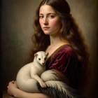 A young woman with long, wavy hair holds a white ferret close to her chest, wearing a deep red dress with intricate details. The warm background enhances her serene expression.