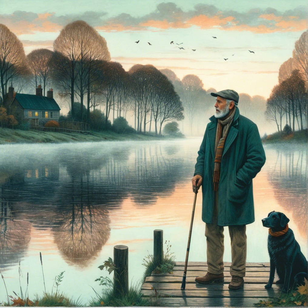 An elderly man with a cane stands at a wooden dock by a quiet lake during twilight. A loyal black dog sits beside him. Behind, a cozy cottage nestles under bare trees, reflecting softly on the calm water under pastel skies.