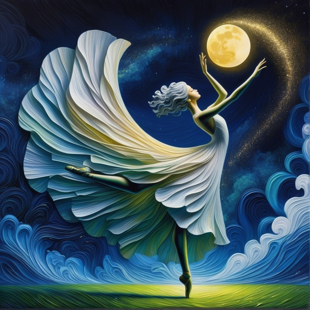 A graceful dancer in a flowing white dress reaches for a glowing moon against a deep blue night sky, surrounded by swirling clouds and a magical atmosphere.