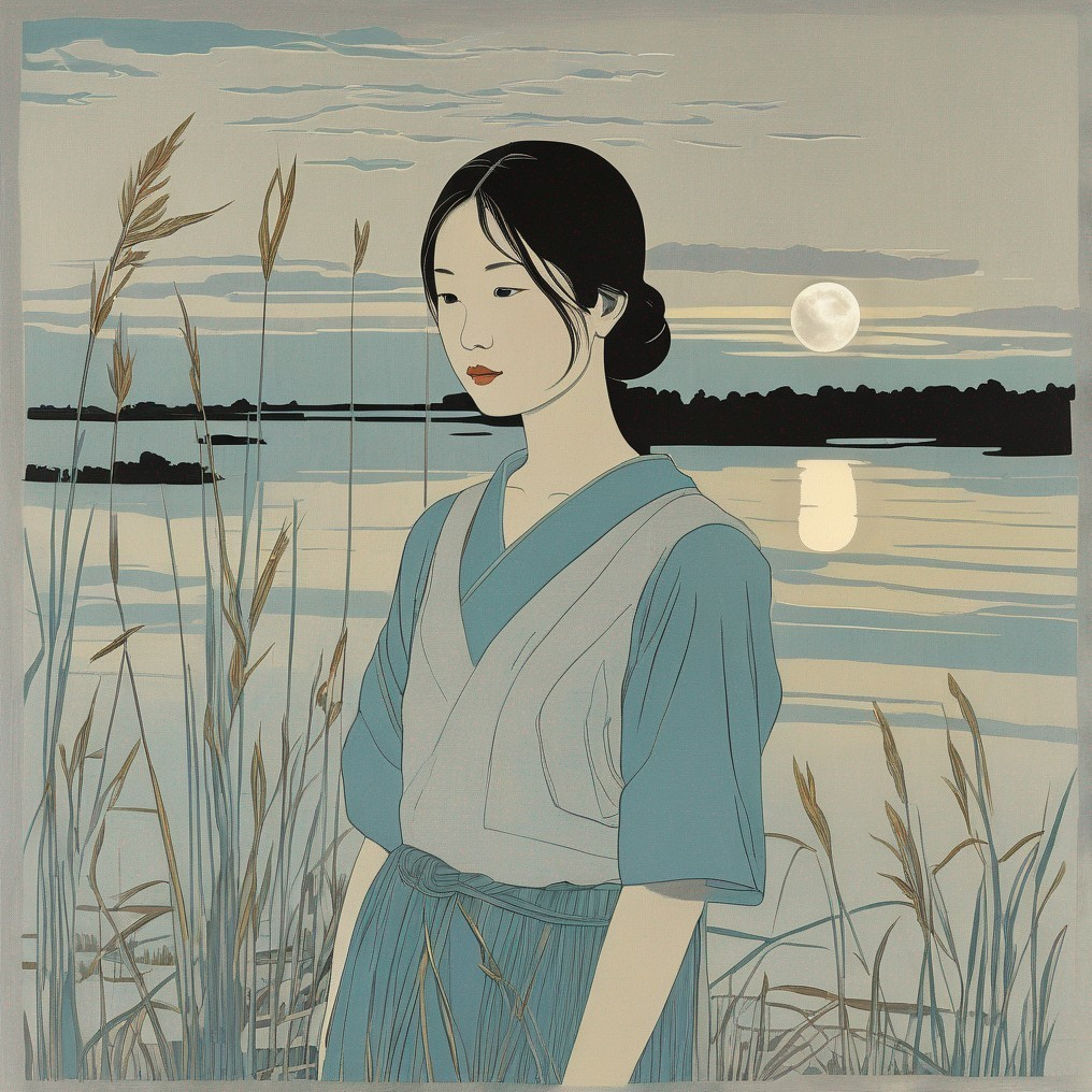 off center design, the  young Jpanese girl who wants to be a botanist, observing birds and plants,  is sheltering in the reeds, delicate and fine lines in the linocut, night on the marsh,, elimated sun in distance only clouds and light, off center design, blues and yellows, faded grey turquoise in the sky, more distinct lines in the linocut, faded colors, vintage, the bird sactuary in Canada, sorrounded by marsh flowers including flat topped white astor, Water hemlock, creeping water primrose, blue vervain, spotted joe pie weed, greater fringed gentian,, , more distinct lines in the lino cut, add pale grey turquoise to the sky, a scene viewed in New Jersey, night in August, Intricate linocut art of grasses and flowers and faded dried flower heads,in the orginal monocolor of the prompt image, lines create shading, in the style of  kay sage, raw figuration,, trompe l'oeil compositions, rusticcore , .. surreal, beautiful. This is a wide landscape. 13" x 19"