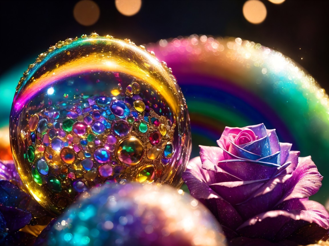 A captivating scene featuring a shimmering bubble adorned with vibrant colors and bubbles, surrounded by sparkling roses and a rainbow backdrop, creating a whimsical, magical atmosphere.