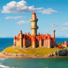 A fantastic seaside castle with tall, red-tipped towers and stone walls, surrounded by blue waters. Sailboats drift nearby, while visitors explore the sandy beach and lush green area.
