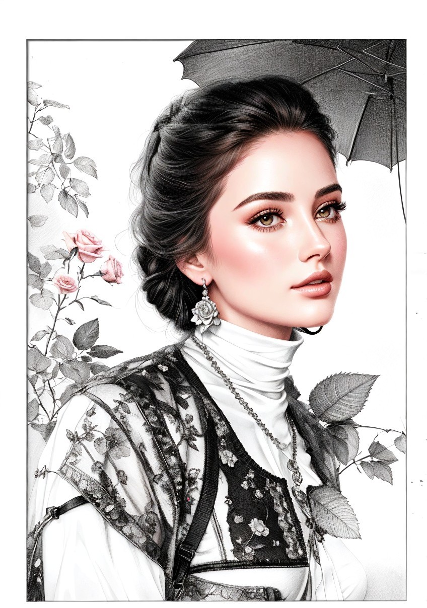 A portrait of a woman with braided hair and a leather jacket, posing against a backdrop of roses and leaves.