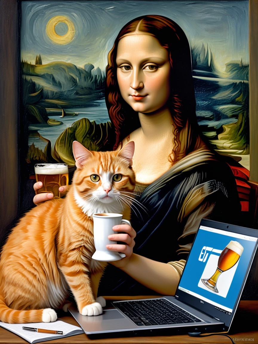 The image reimagines a classical portrait with a woman resembling Mona Lisa, holding a pipe and a beer while using a laptop, accompanied by an orange cat next to her.