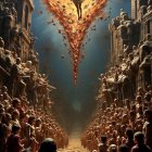 A majestic figure with fiery wings emerges amidst a crowd, illuminated by beams of light. The scene exudes a sense of awe and transformation, blending divine elements with human emotion.