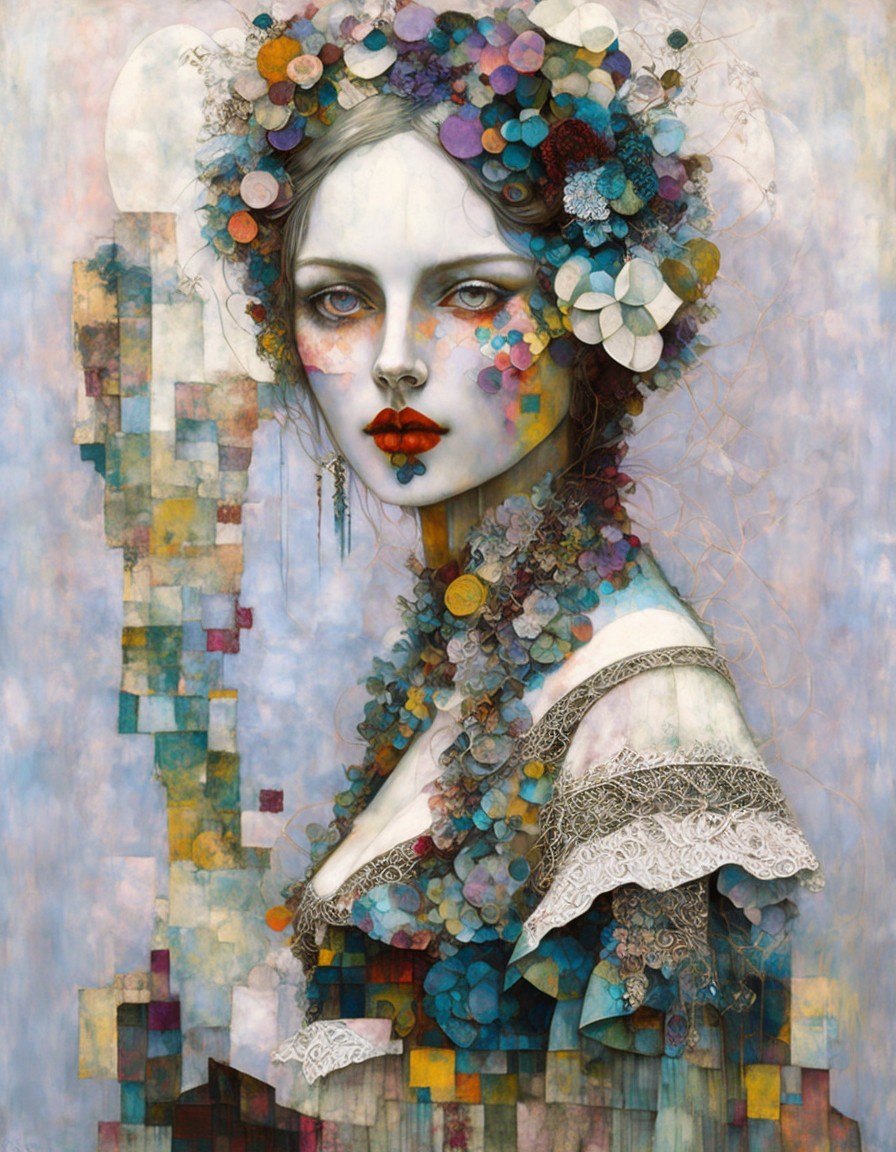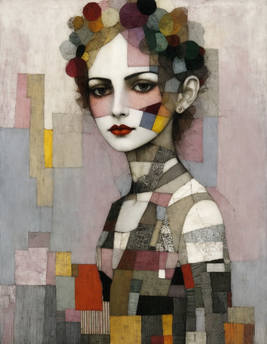 Cubist-style portrait of a woman with geometric shapes and earthy tones, featuring prominent eyes and checkered headpiece.