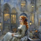 A young woman in an elegant dress sits in a quaint courtyard, surrounded by glowing lanterns, pumpkins, and a delicate spiderweb, creating an enchanting, autumnal atmosphere.