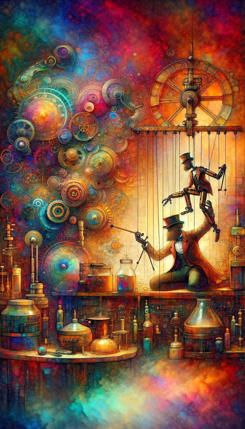 A steampunk scene with individuals in vintage attire among fantastical machines and globes with a warm, vivid color palette.