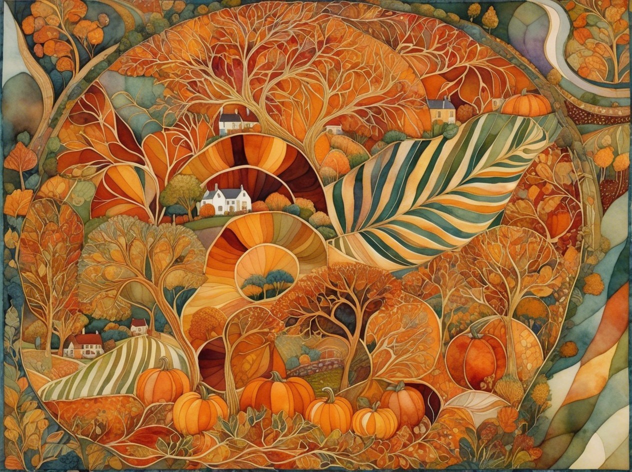 A vibrant, autumn-themed illustration featuring rolling hills, colorful trees, and cozy houses, surrounded by orange pumpkins, evoking a warm, harvest atmosphere.