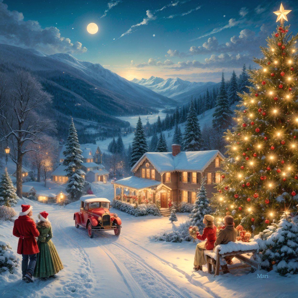 A picturesque winter scene features a cozy house adorned with holiday lights, surrounded by snow-covered trees. A vintage car is parked nearby, while people in festive attire enjoy the festive ambiance.