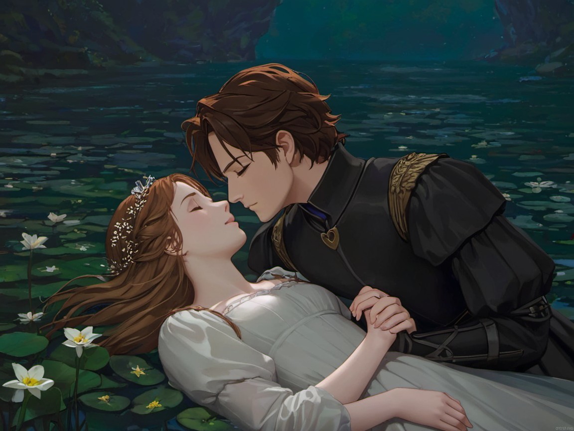 A romantic scene set by a tranquil pond, featuring a couple gazing into each other's eyes. The woman wears a flowing dress and a floral crown, while the man dons an elegant dark outfit.