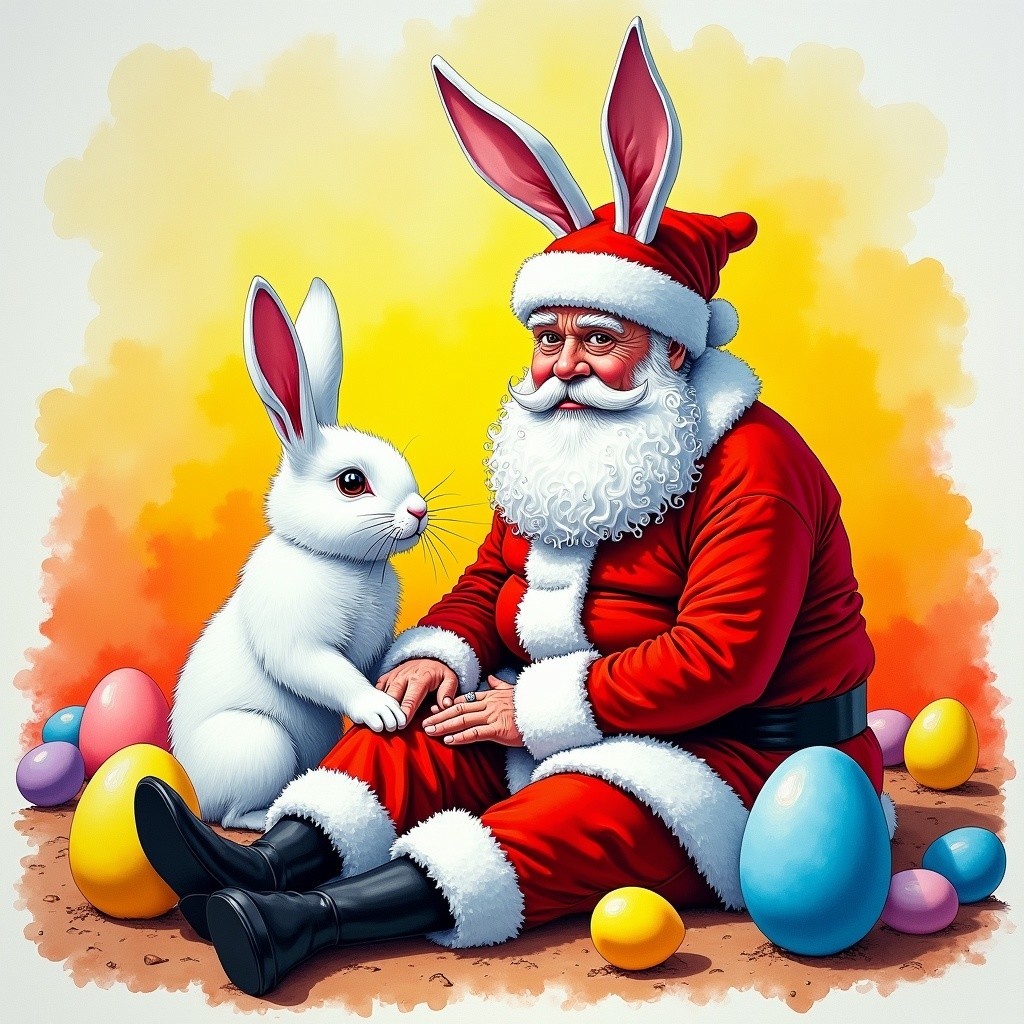Santa Claus, donning bunny ears, appears puzzled and melancholic amidst a surreal Easter landscape. Bright, psychedelic eggs float in the air while a tiny bunny nestles in his fur-trimmed coat, symbolizing seasonal confusion. The contrast is both playful and existential.