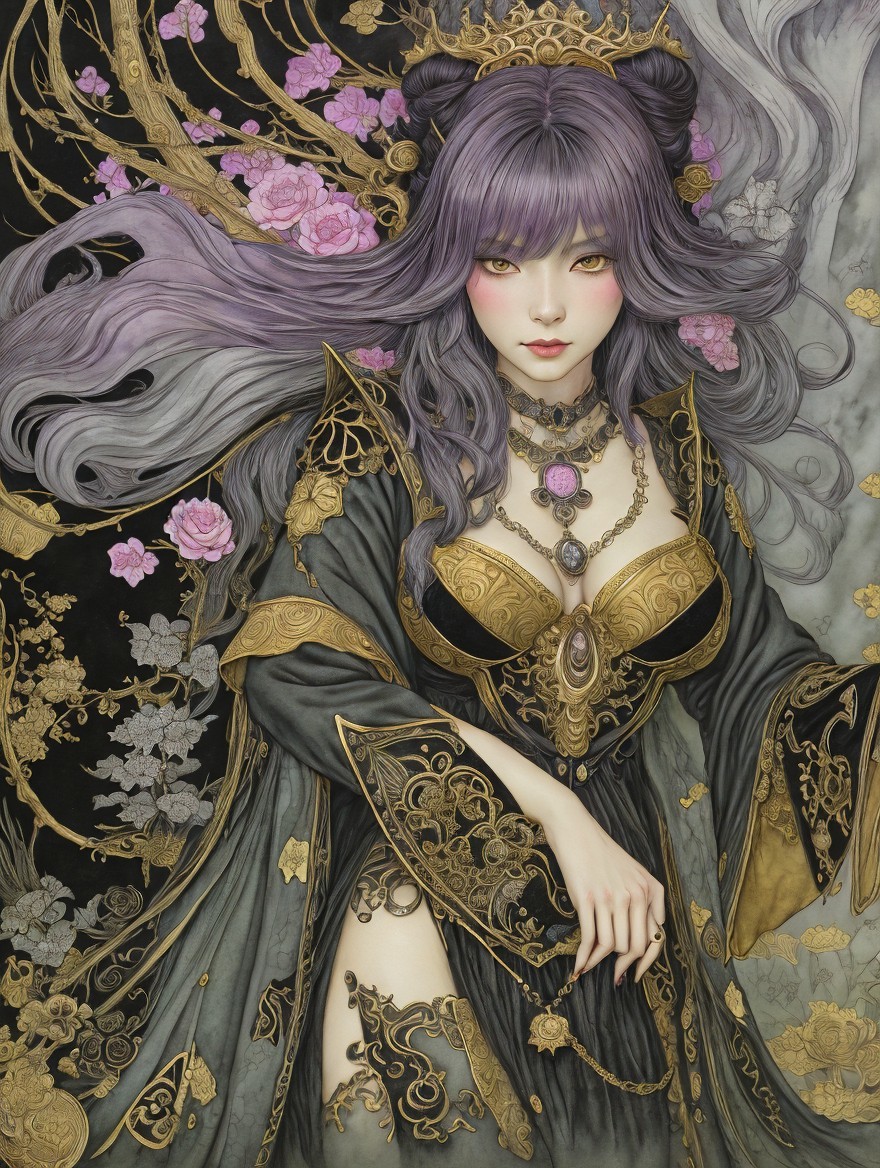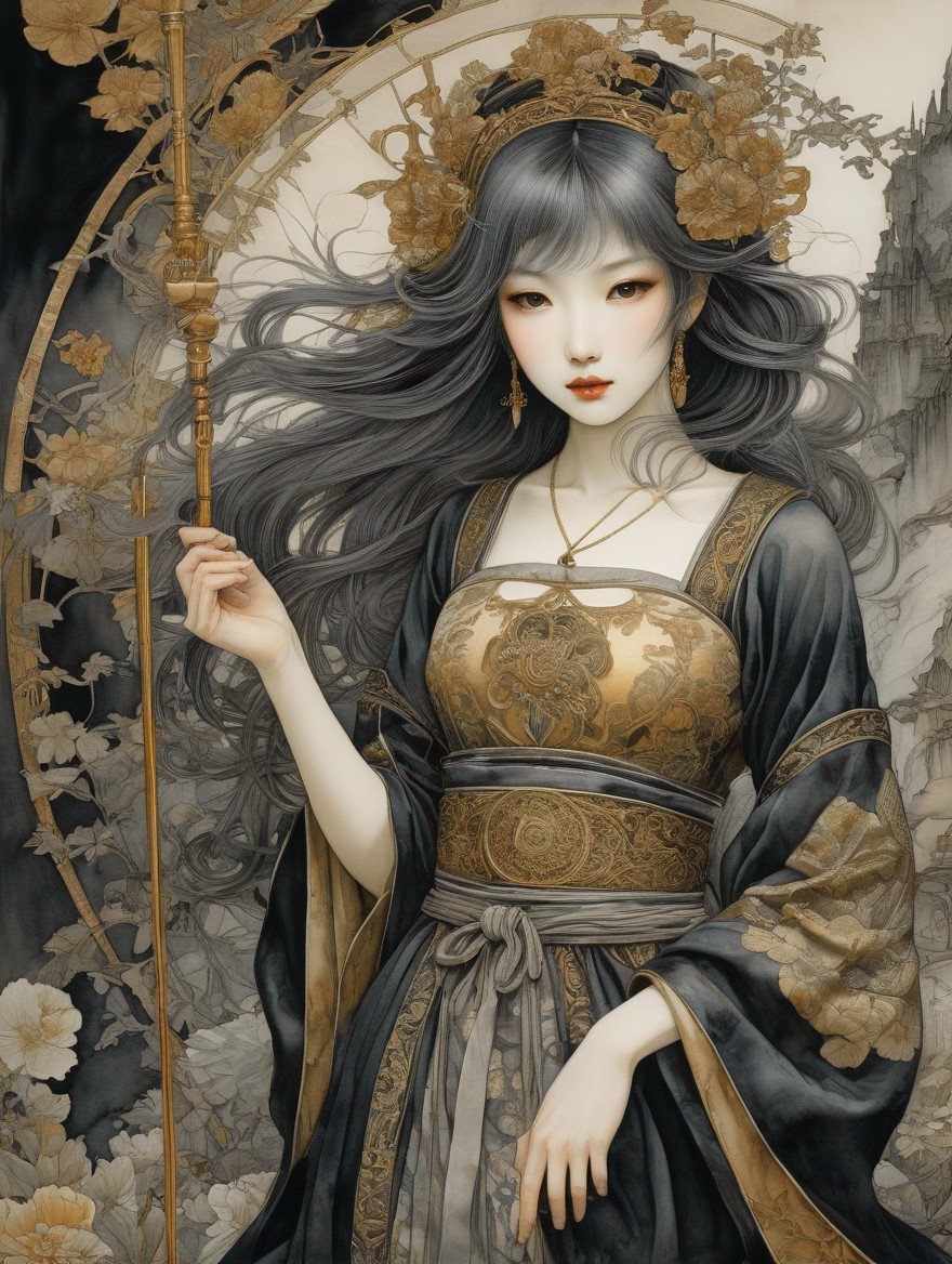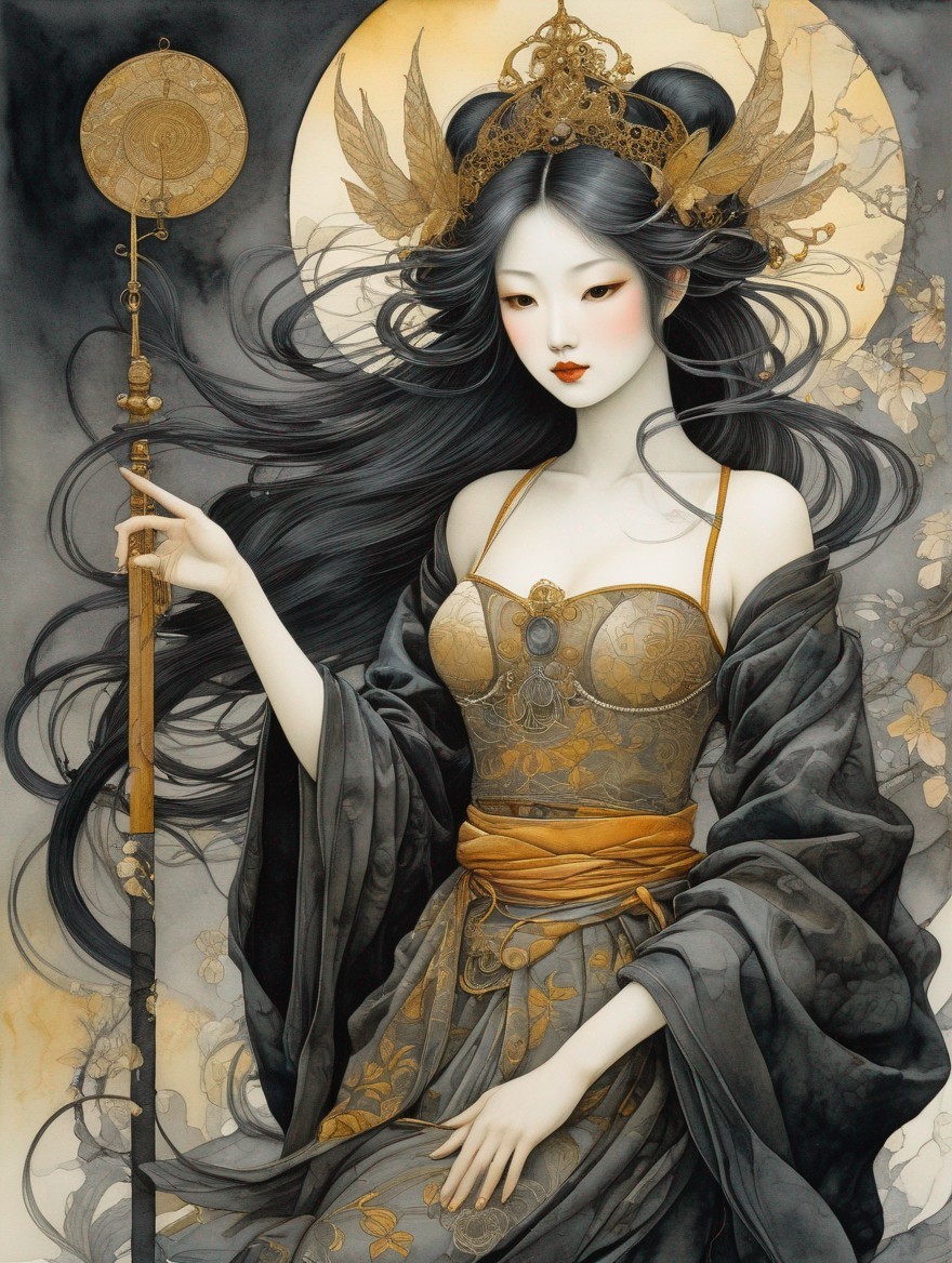 A surreal portrait of a pale woman with a globe headpiece, framed by hanging celestial orbs, blending Renaissance and fantasy styles.