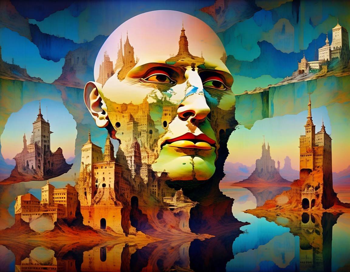 The image features a surreal landscape with a woman's face emerging from tranquil waters, framed by rugged cliffs and a castle. The scene combines dreamlike elements with vivid colors. This comes a few generations after an image of Thomas Merton, a Trappist monk who was rather famous in the sixties. It is a fact that the Google Deep Dream program swaps genders of people as often as not.