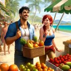 A vibrant beach market scene featuring a smiling man and woman carrying a basket of fresh fruits. Lush palm trees and colorful stalls create a lively, tropical atmosphere.