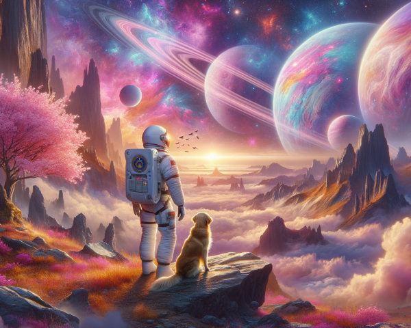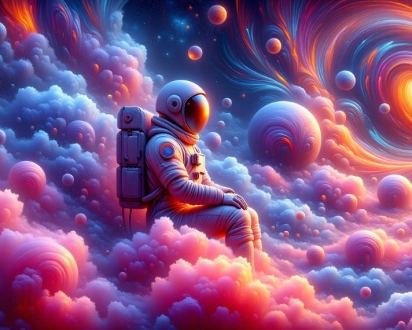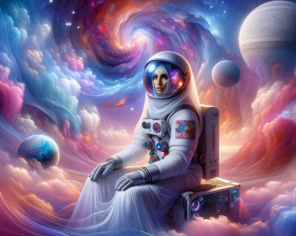 A vibrant, dreamlike landscape features a woman's face emerging from colorful swirls. Butterflies flutter around her as the sun sets behind majestic mountains, illuminating a winding path.