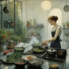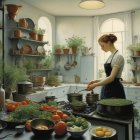 In a cozy kitchen, a woman in period attire prepares food, surrounded by pots, vegetables, and herbs. Soft light filters through a window, illuminating the rustic decor and warm atmosphere.