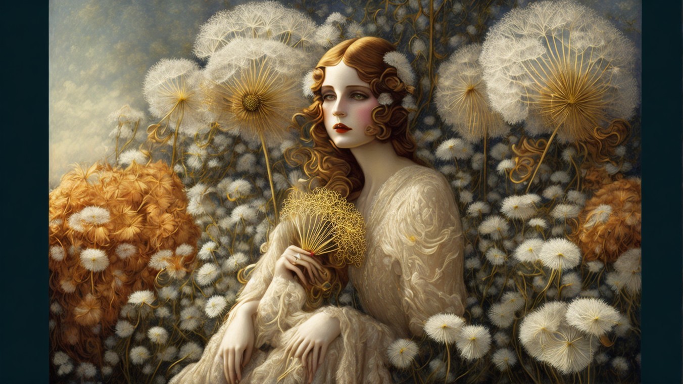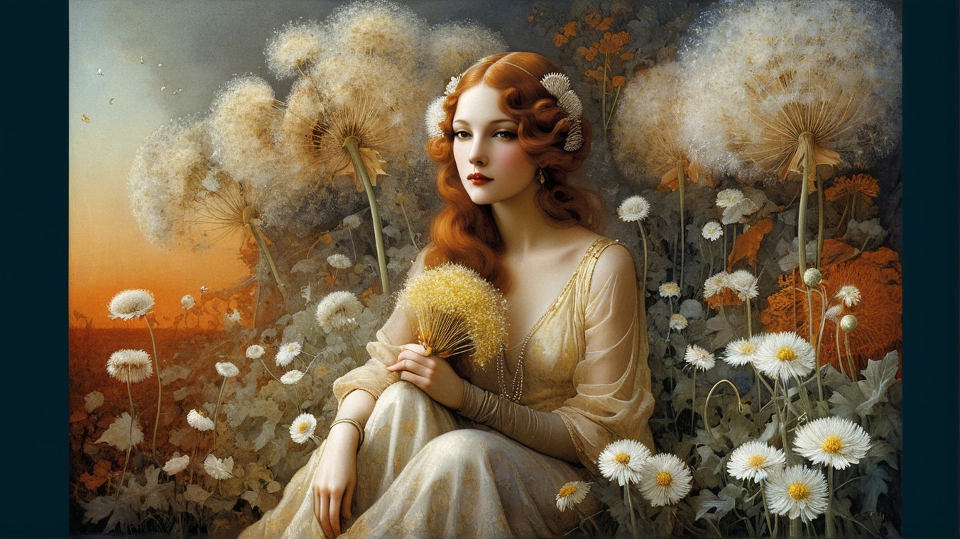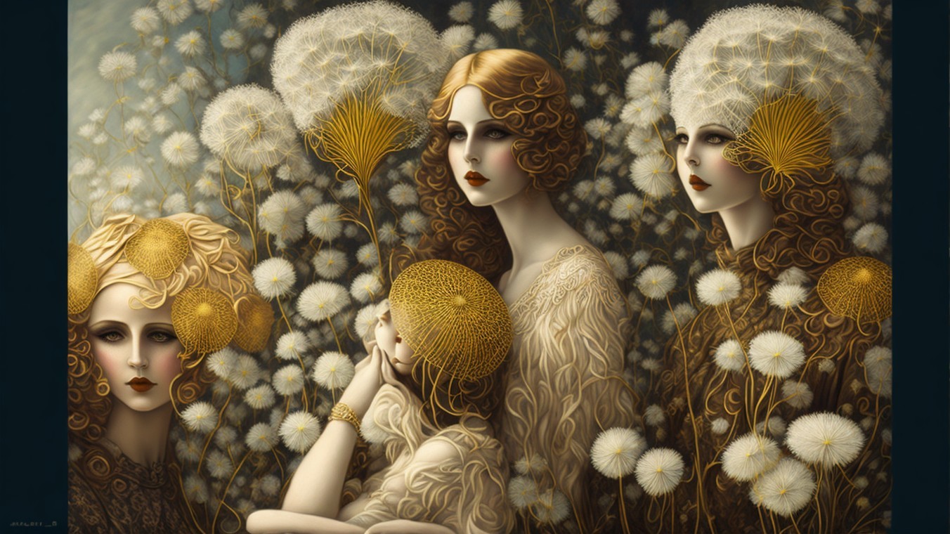 Two elegant women are surrounded by dandelions, one holding a vibrant yellow bouquet, while the other rests thoughtfully, adorned with flowers in her hair, exuding a serene, artistic aura.