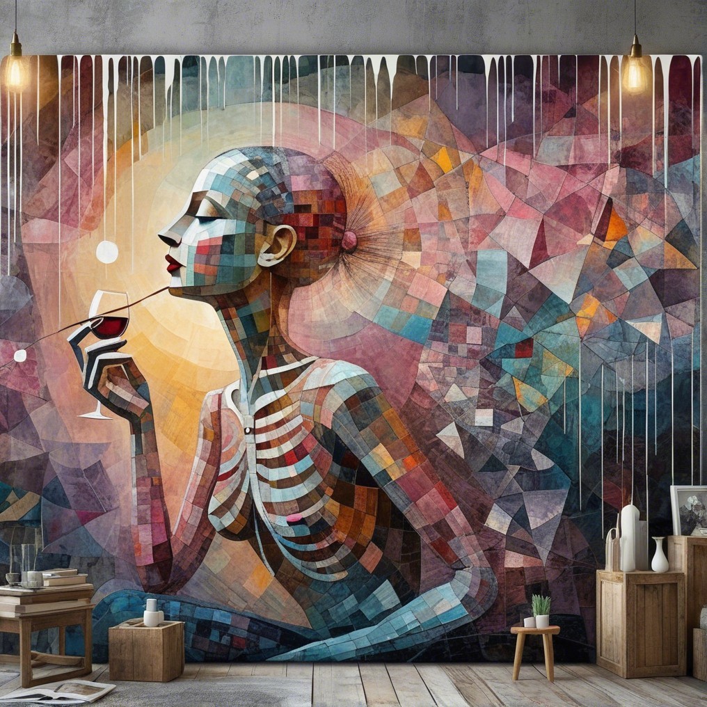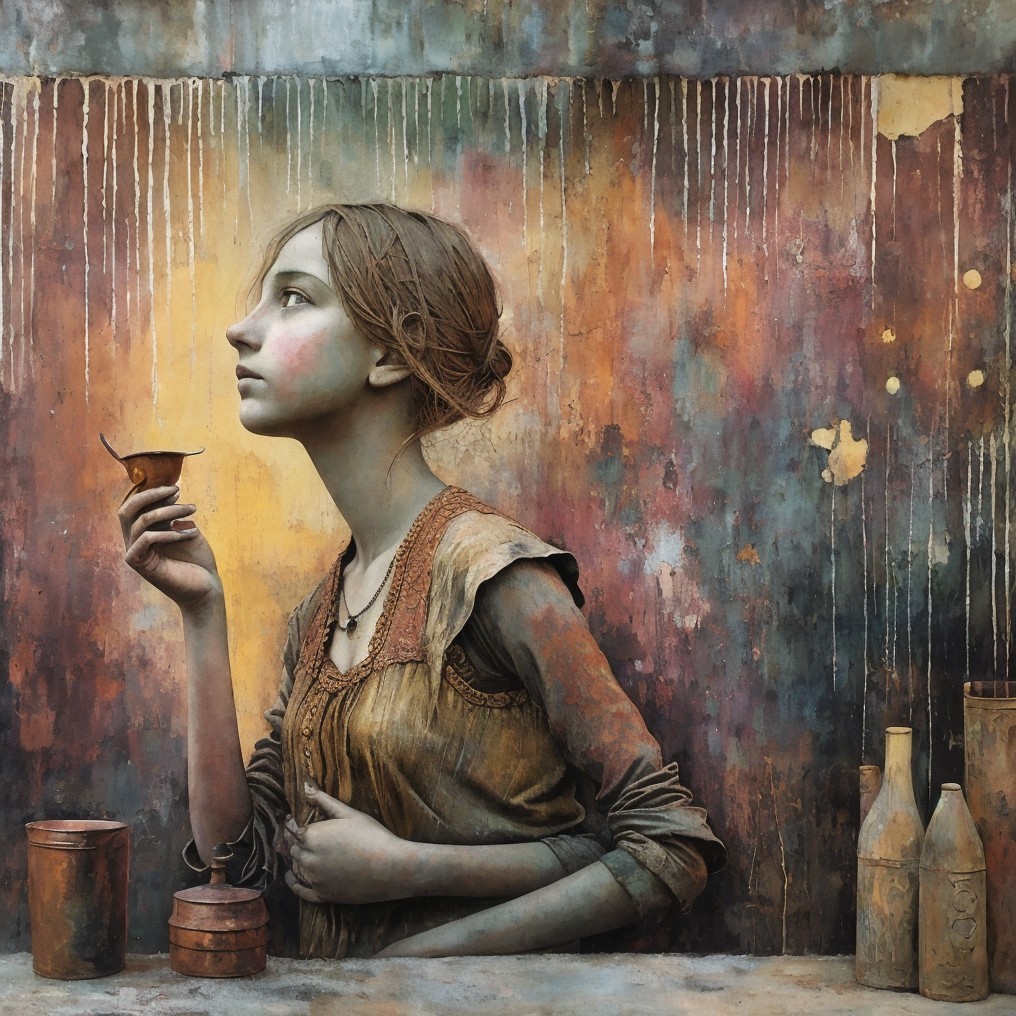 A portrait of a young woman in profile, set against a textured backdrop of warm hues. She wears a simple dress and holds a delicate object, evoking a blend of nostalgia and artistry.