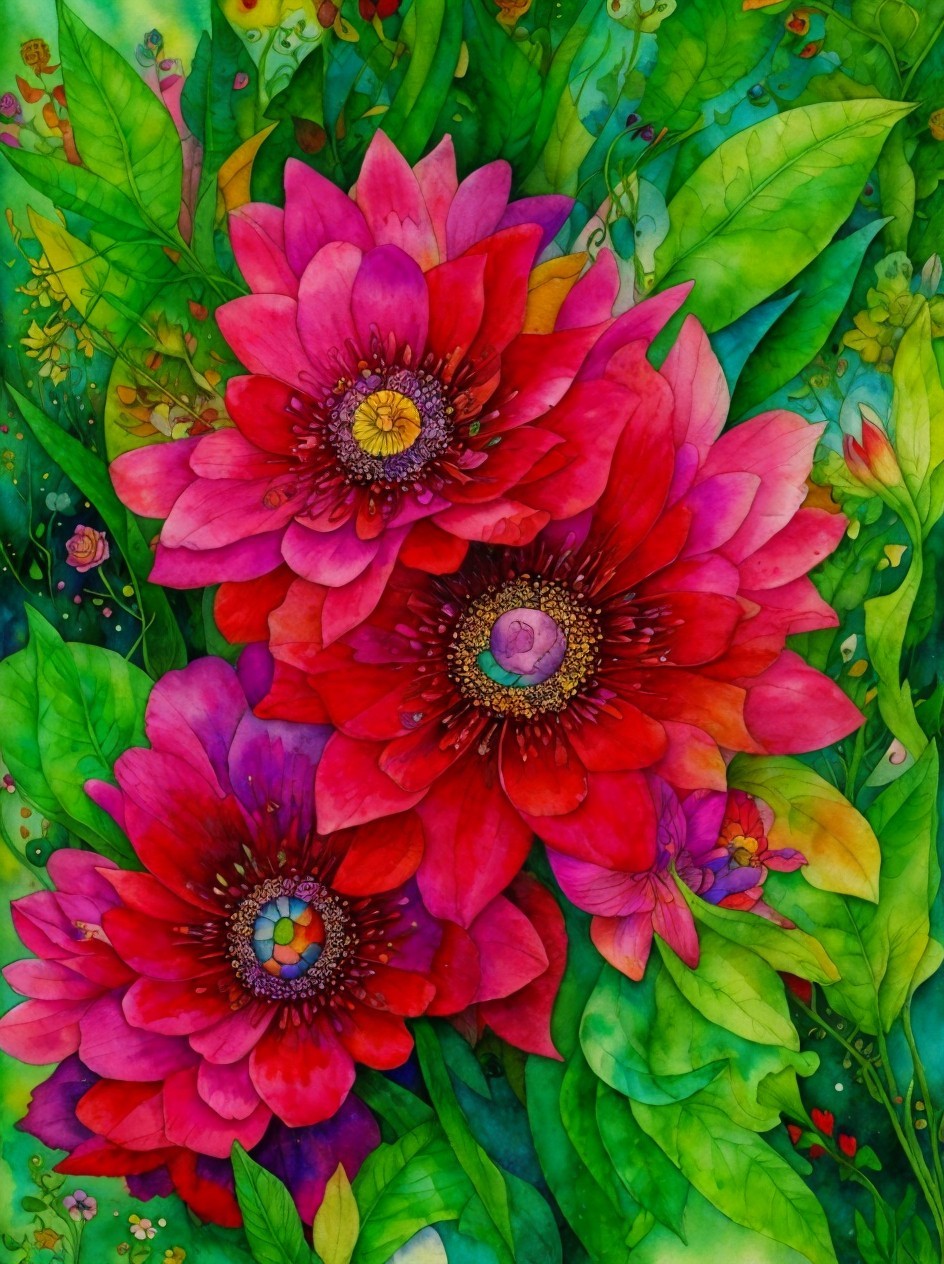 Vibrant Painting of Red and Pink Flowers with Green Leaves