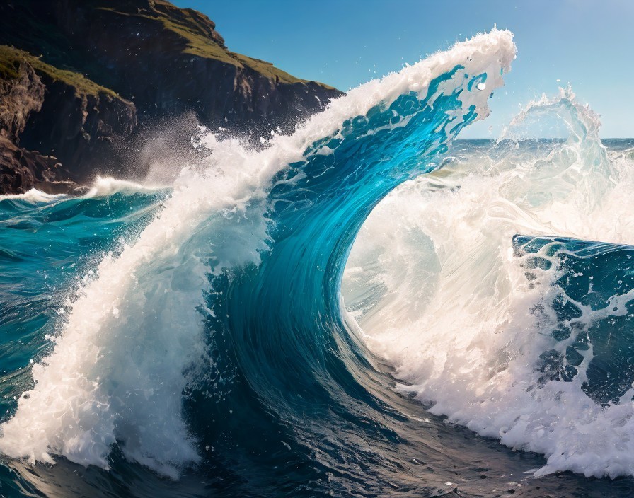 Large Blue Wave Cresting Against Rocky Cliffs & Clear Sky