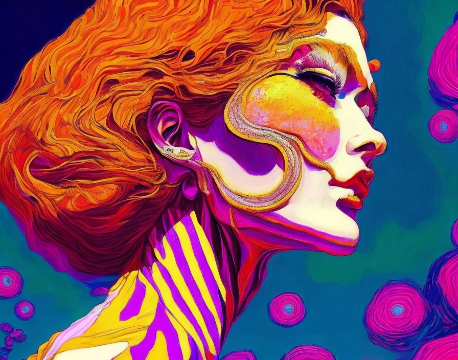 Vibrant digital art of a woman with fiery red hair, striking makeup, and a patterned yellow outfit against a psychedelic blue and pink background.