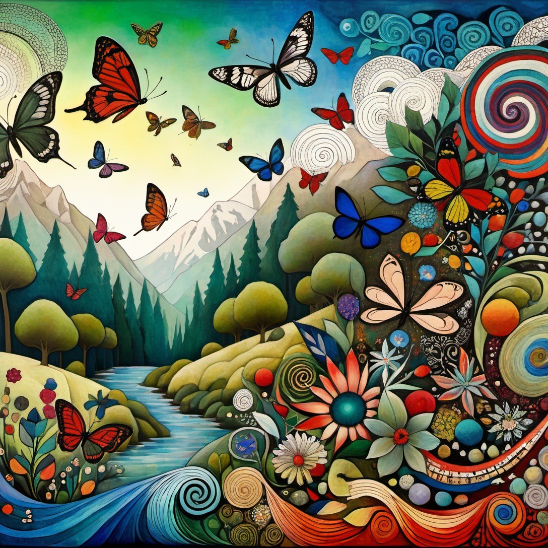 A vibrant artwork featuring a whimsical landscape with colorful butterflies, flowing rivers, patterned hills, and abstract swirls in the sky.
