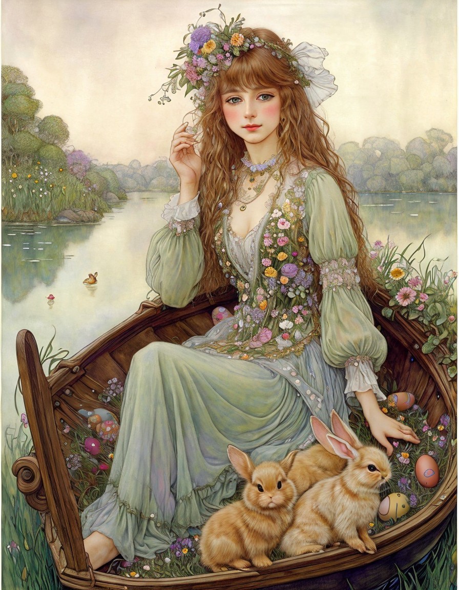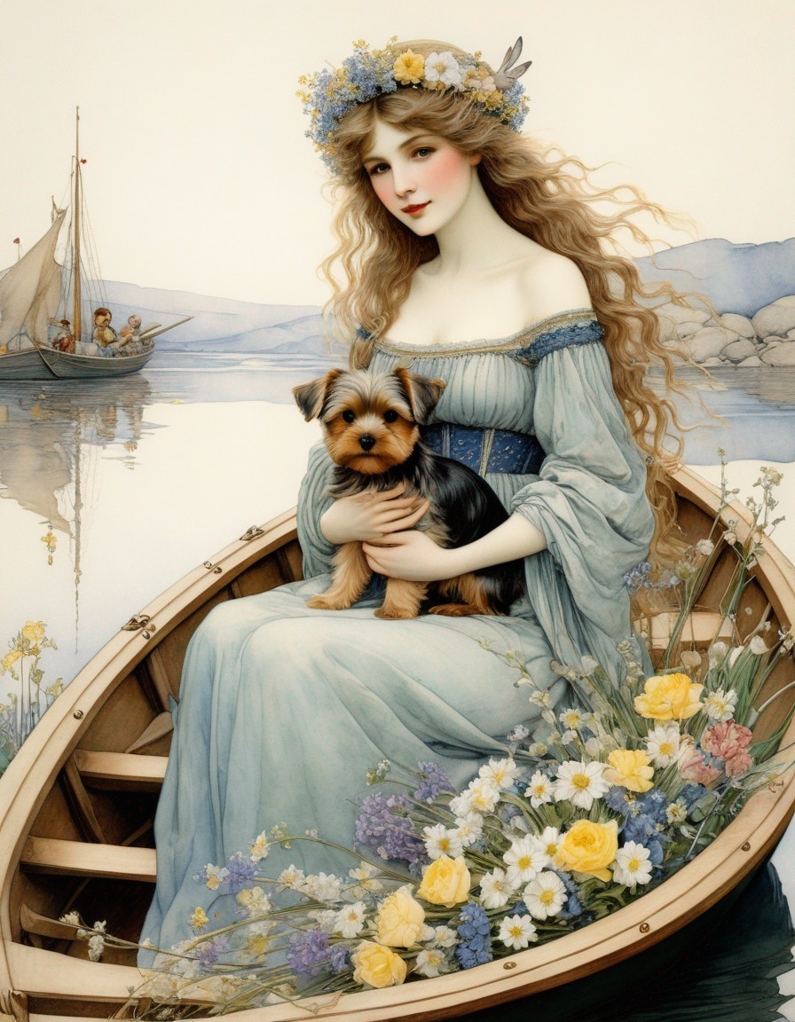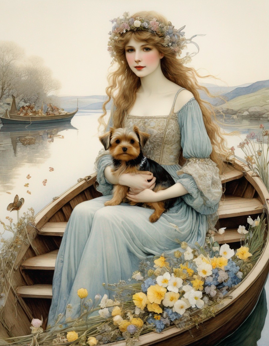 A woman in a blue dress adorned with flowers holds a small dog in a boat surrounded by water and blooming flowers.