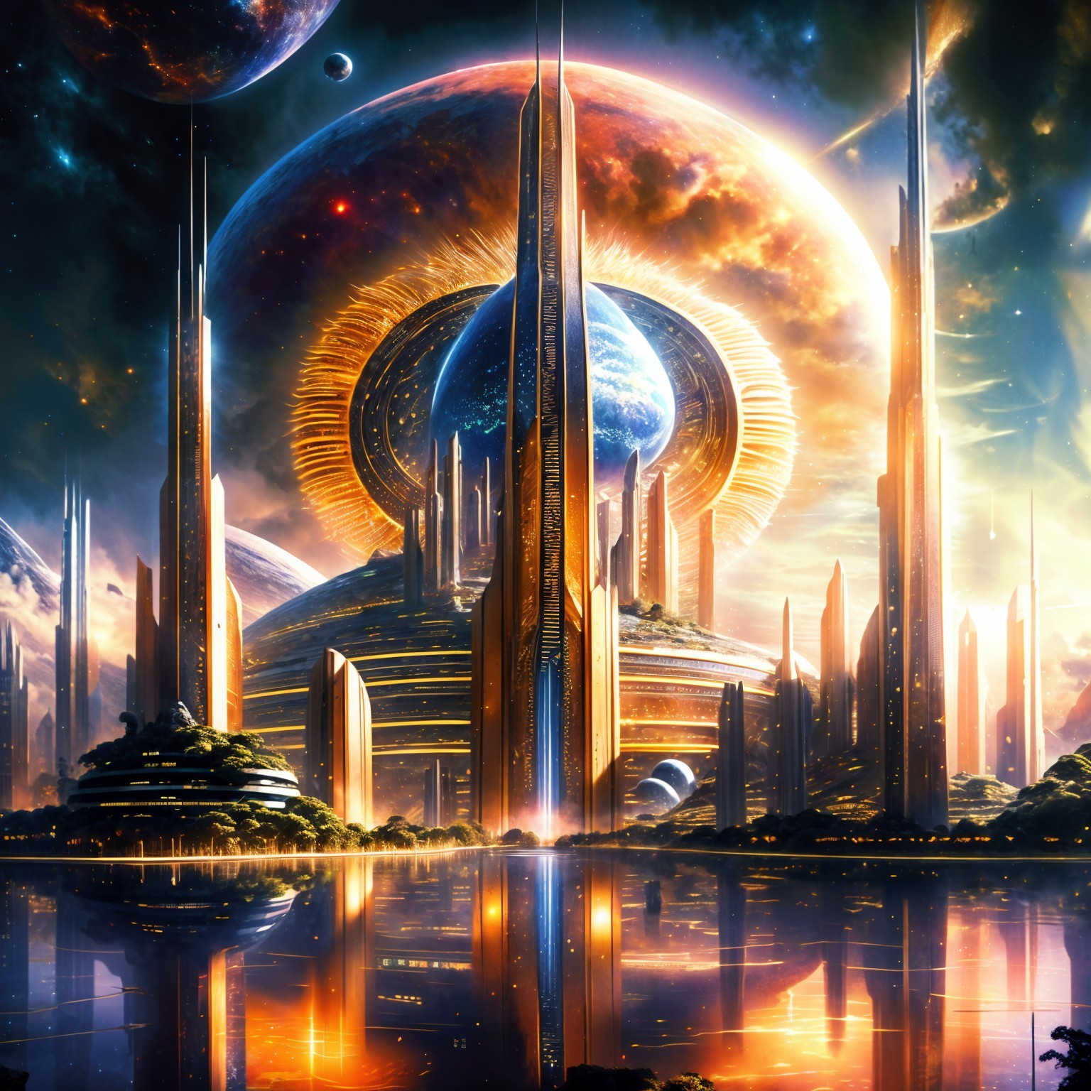 A futuristic cityscape features towering skyscrapers with glowing spires, surrounded by orbiting planets and vibrant cosmic phenomena, showcasing a harmonious blend of technology and space.