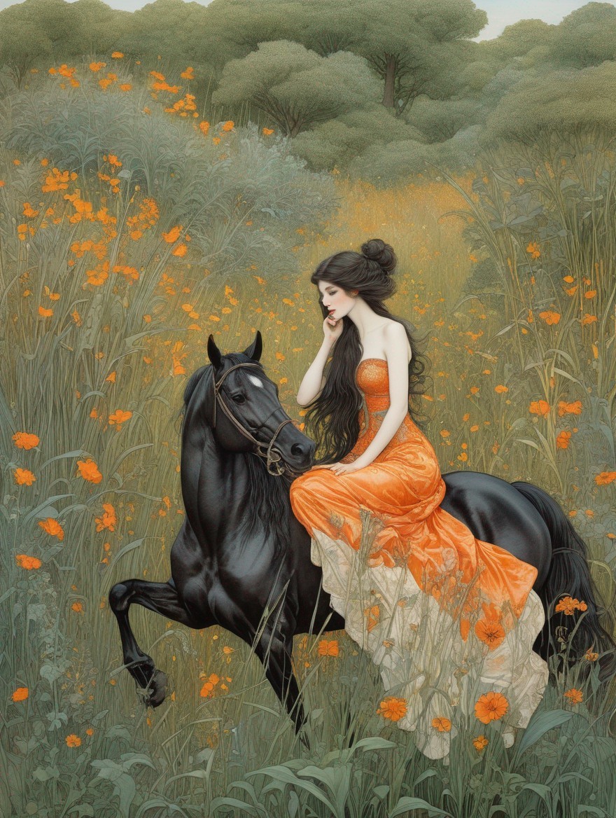 A woman in an orange dress rides a black horse through a meadow dotted with orange flowers, her hair flowing behind her.