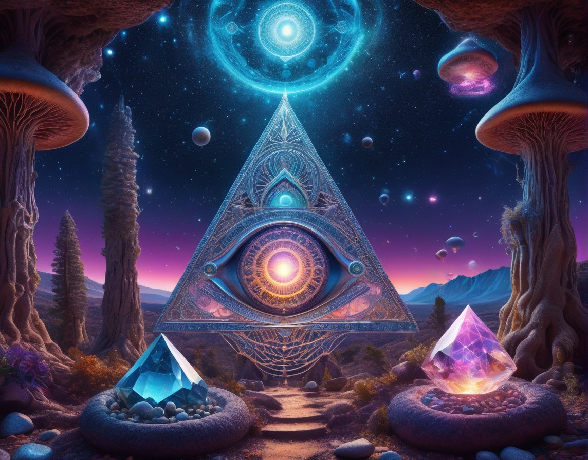 surreal deep dream concept, realistic psilocybin mushrooms intertwined with giant crystals, futuristic aliens engaging in time travel, alchemy, and magic. Embrace chaos magic, sacred geometry, mystical occultism with symbols like the hamsa, eye of providence, talisman, and esoteric elements. Incorporate tarot, psychic pagan occult references. Envision a scene with a pyramid under a celestial sun and moon, hinting at astral projection and mystical encounters. Explore the theme of cosmic entities, trippy mushrooms, and psychedelic experiences with galactic dmt beings, shamanic LSD art, magic mushrooms, and the enigmatic DMT realm. Capture the essence of mysticism through intricate details and vibrant colors, blending elements of fantasy and reality seamlessly.