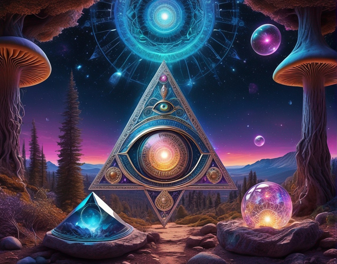 A vivid psychedelic landscape with a mystical triangle portal, glowing mushrooms, celestial orbs, and a forest path under a starry sky.