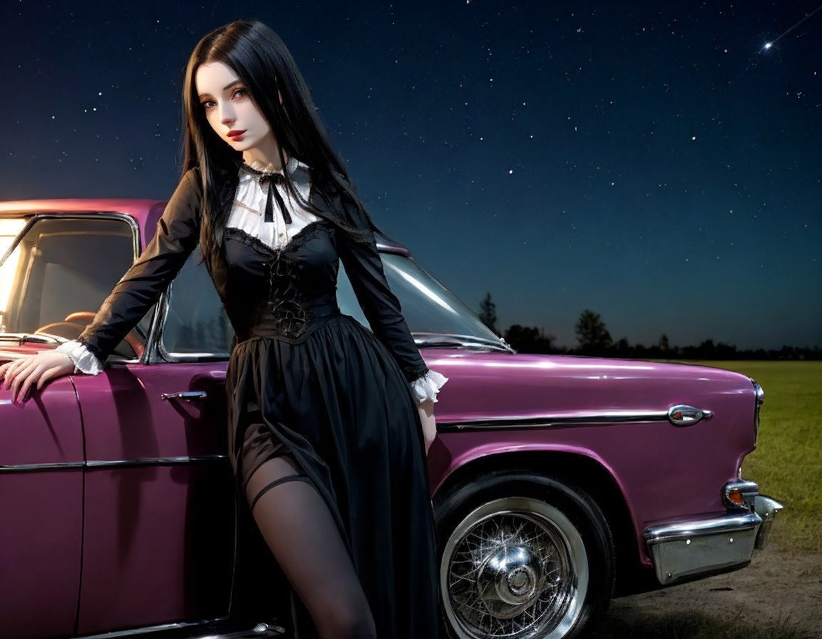 A striking figure in a black, vintage-inspired outfit leans against a classic pink car under a starry night sky, exuding an air of mystery and elegance.