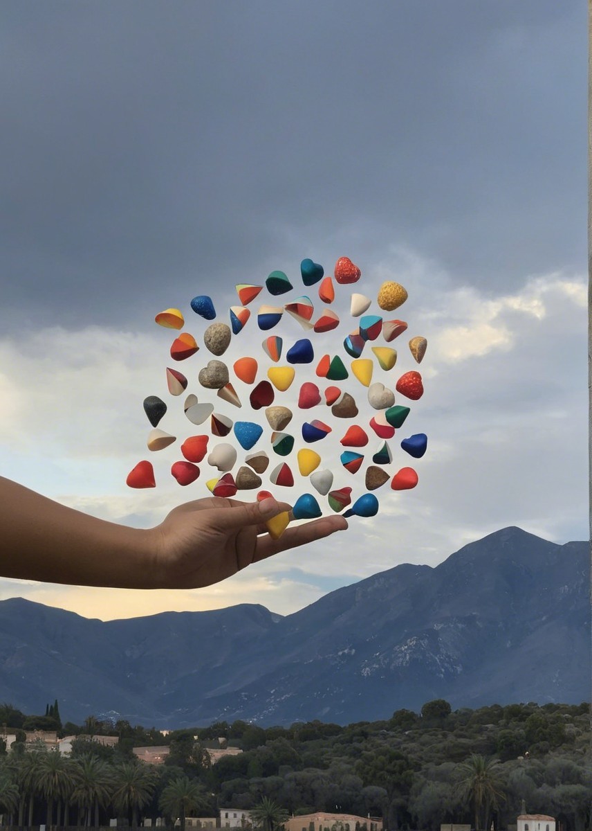 A hand holds a vibrant array of polished gemstones, displaying various colors and shapes against a dramatic sky and rolling hills in the background.