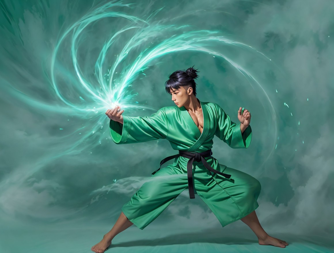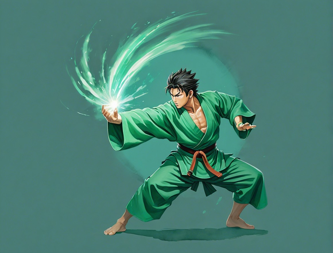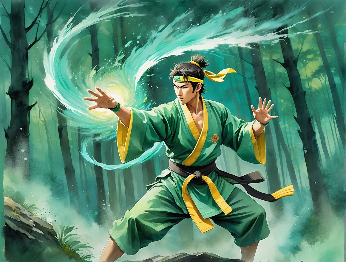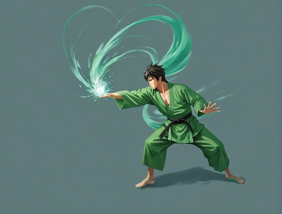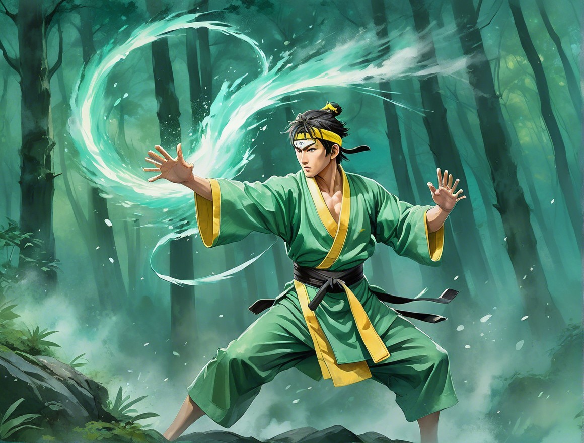 A skilled warrior in a green kimono harnesses energy in a mystical forest. Surrounded by swirling air currents, he prepares to unleash his powerful, elemental magic.