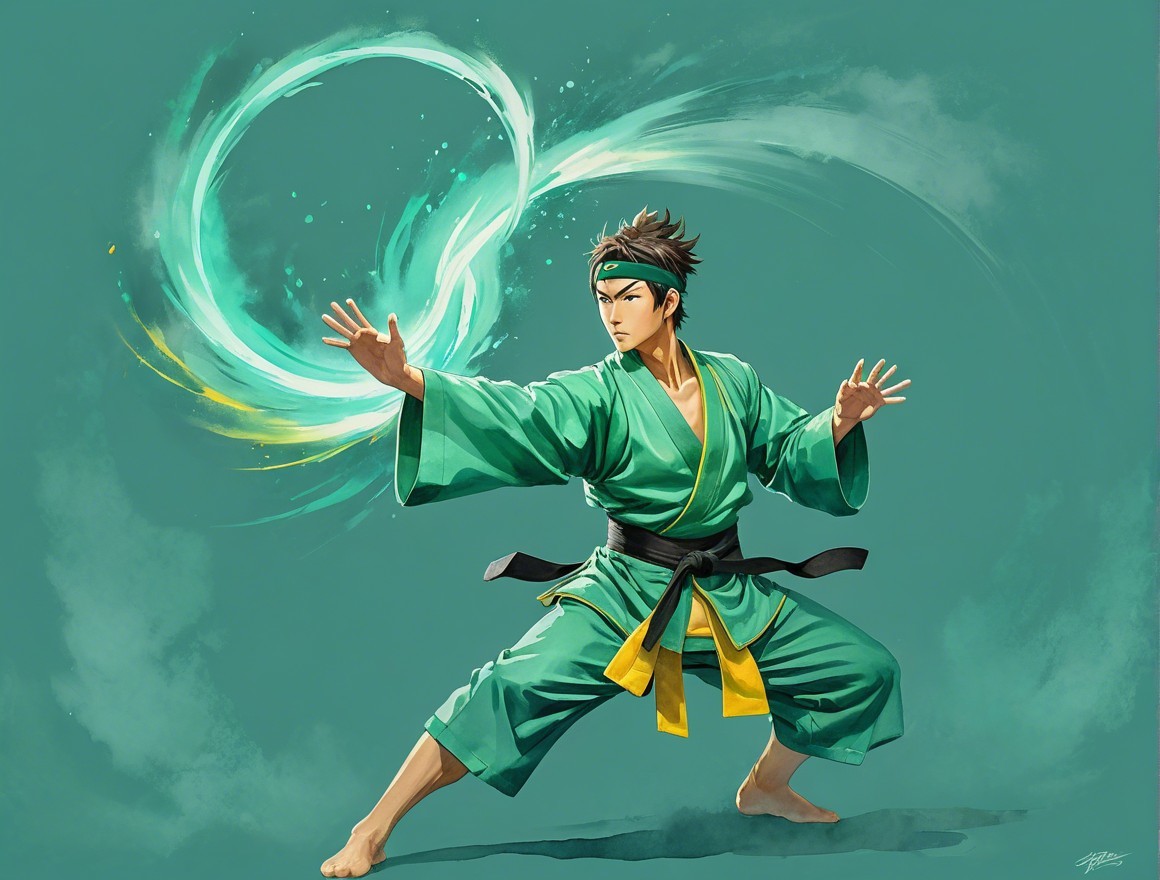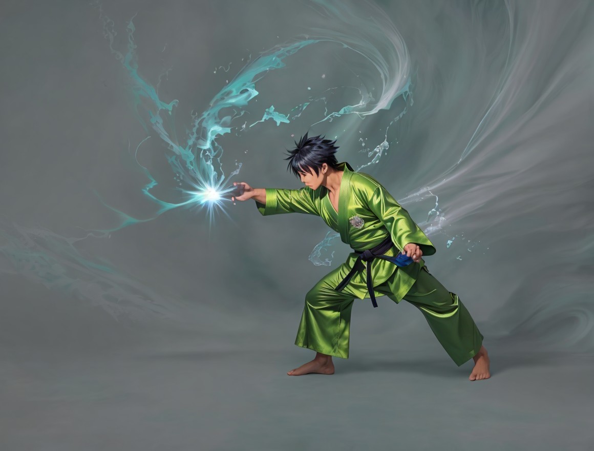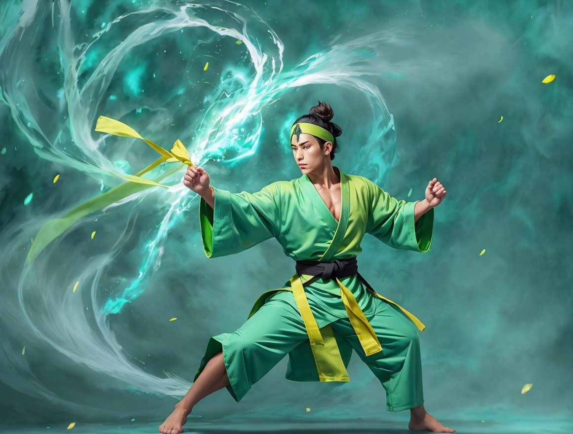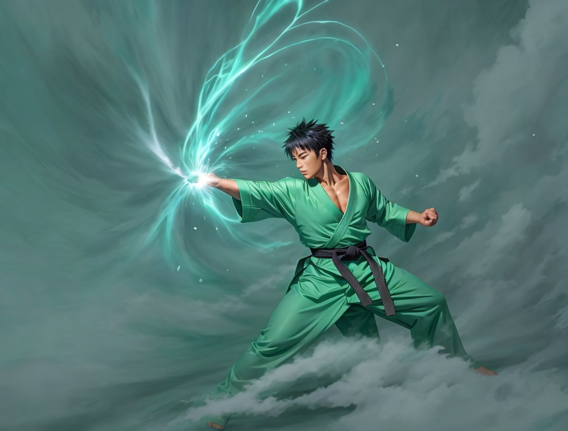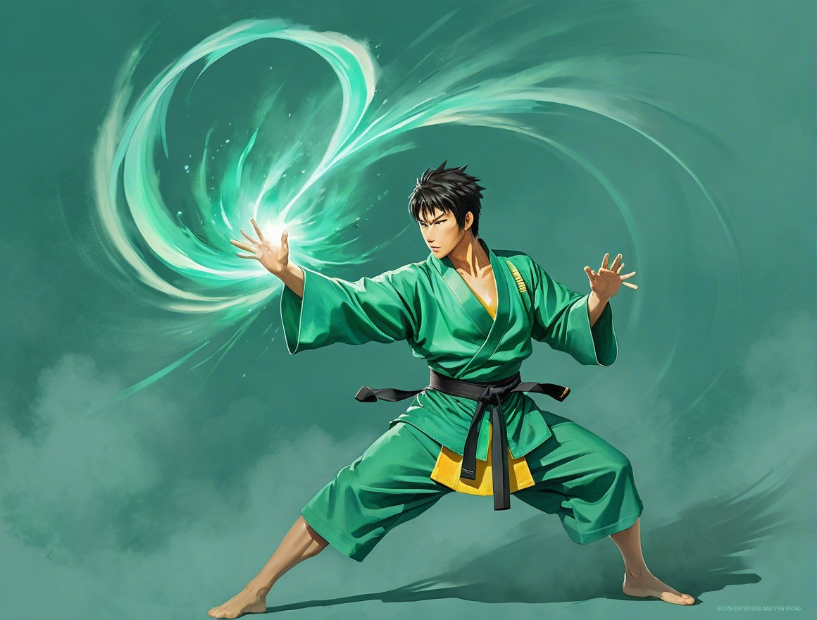 A skilled warrior in a green kimono harnesses energy in a mystical forest. Surrounded by swirling air currents, he prepares to unleash his powerful, elemental magic.