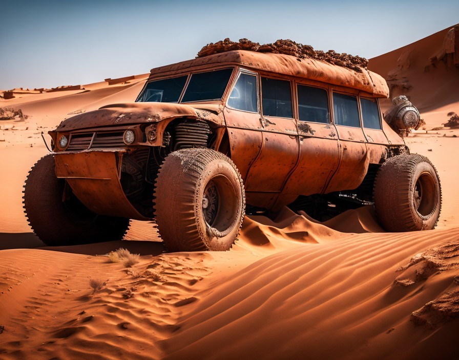 Vintage off-road vehicle with large tires parked on a desert sand dune under a clear sky.